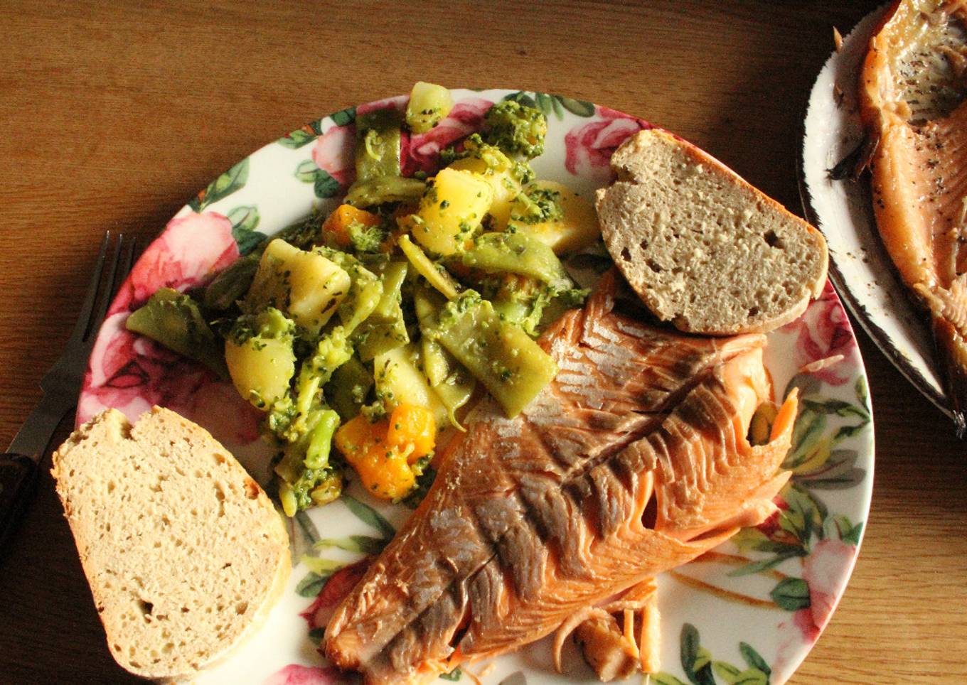1 trucha arco iris chica (1, 5Kg) ahumada casi con todas la de la ley, faltó extracto de limón, no tenía....y otra ensalada súper especial, con papas, calabaza, chauchas y brócoli. La trucha debe ser pescada con mosca por un Racinguista....ya que es la única manera de que salga sabrosa, además con solo 2 grados sobre cero y con una tormenta, poca lluvia pero un viento pal campeonato.