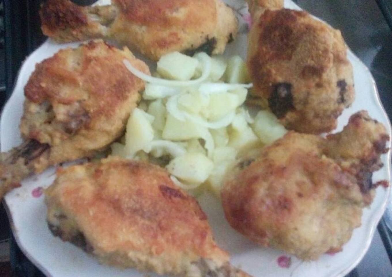 " cocina para semana santa " patitas de pollo riquísimos crocante por fuera y tierno por dentro. Muy fácil especial para los niños lo acompañe con una ensalada de papas , cebolla y aderezos, espero les guste.