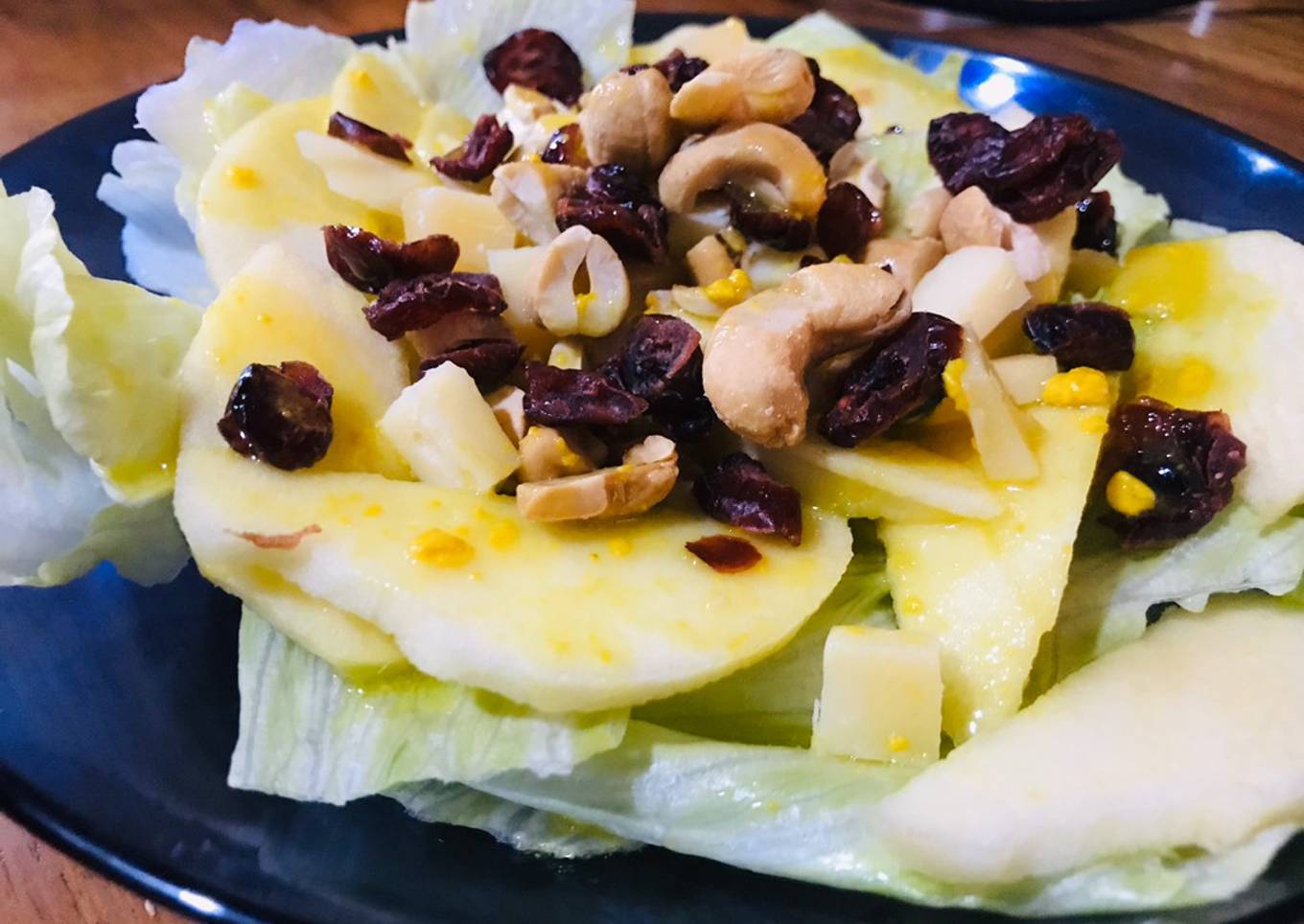 - Agrega en un plato todos los ingredientes: lechuga, manzana, queso, arándanos, nuez de la india y aderezo. Recuerda puedes elegir el tipo de queso que más te agrade, yo le puse parmesano y el aderezo de tu preferencia. Que lo disfrutes!!!