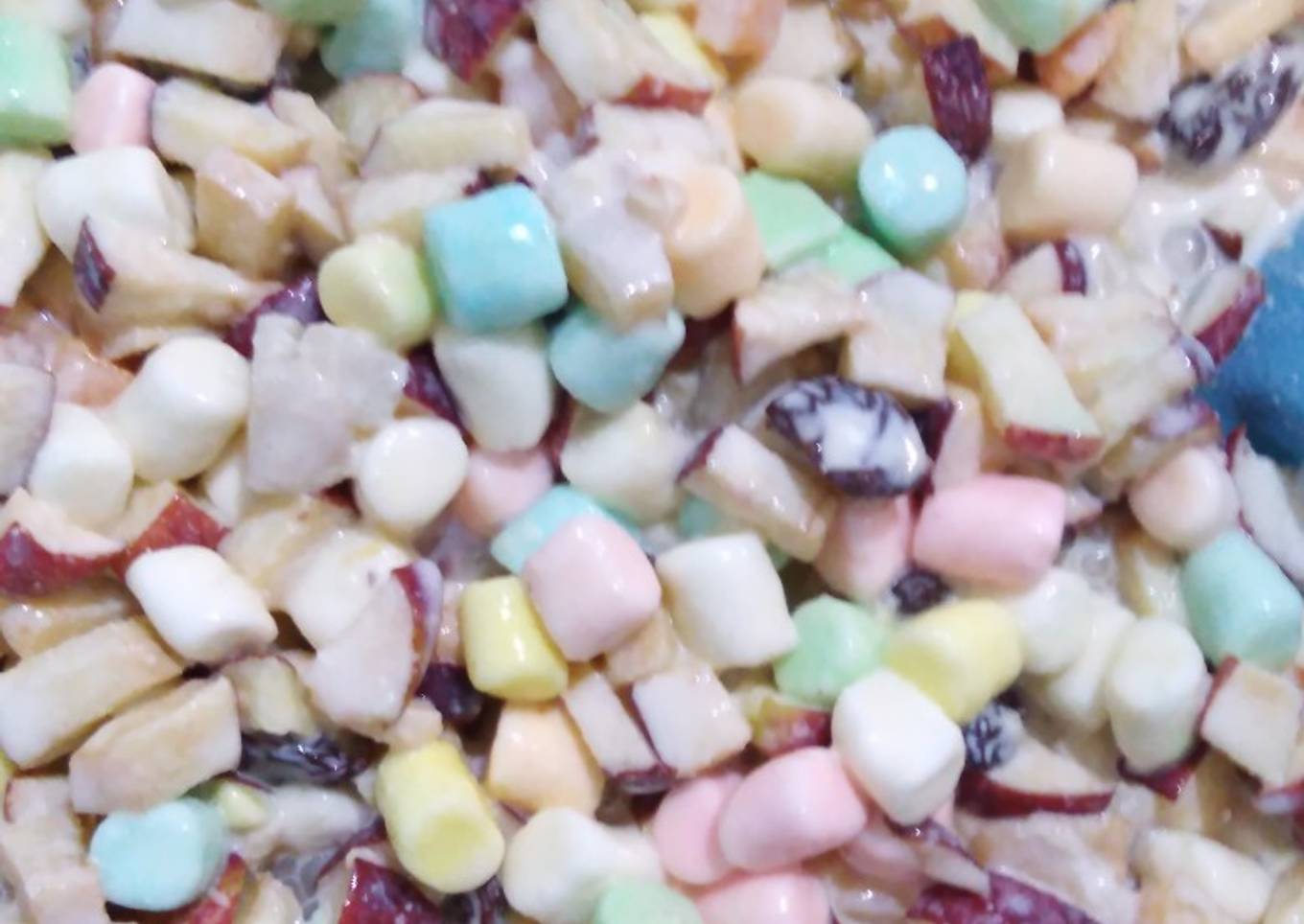 - Cuando terminemos de picar las manzanas agregamos los bombones, la fruta y las pasas