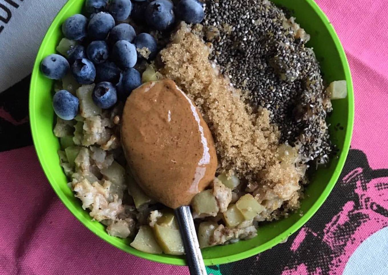 - Cuando esté listo sirve en un plato, agrega el azúcar mascabado, la crema de cacahuate y la fruta que desees.