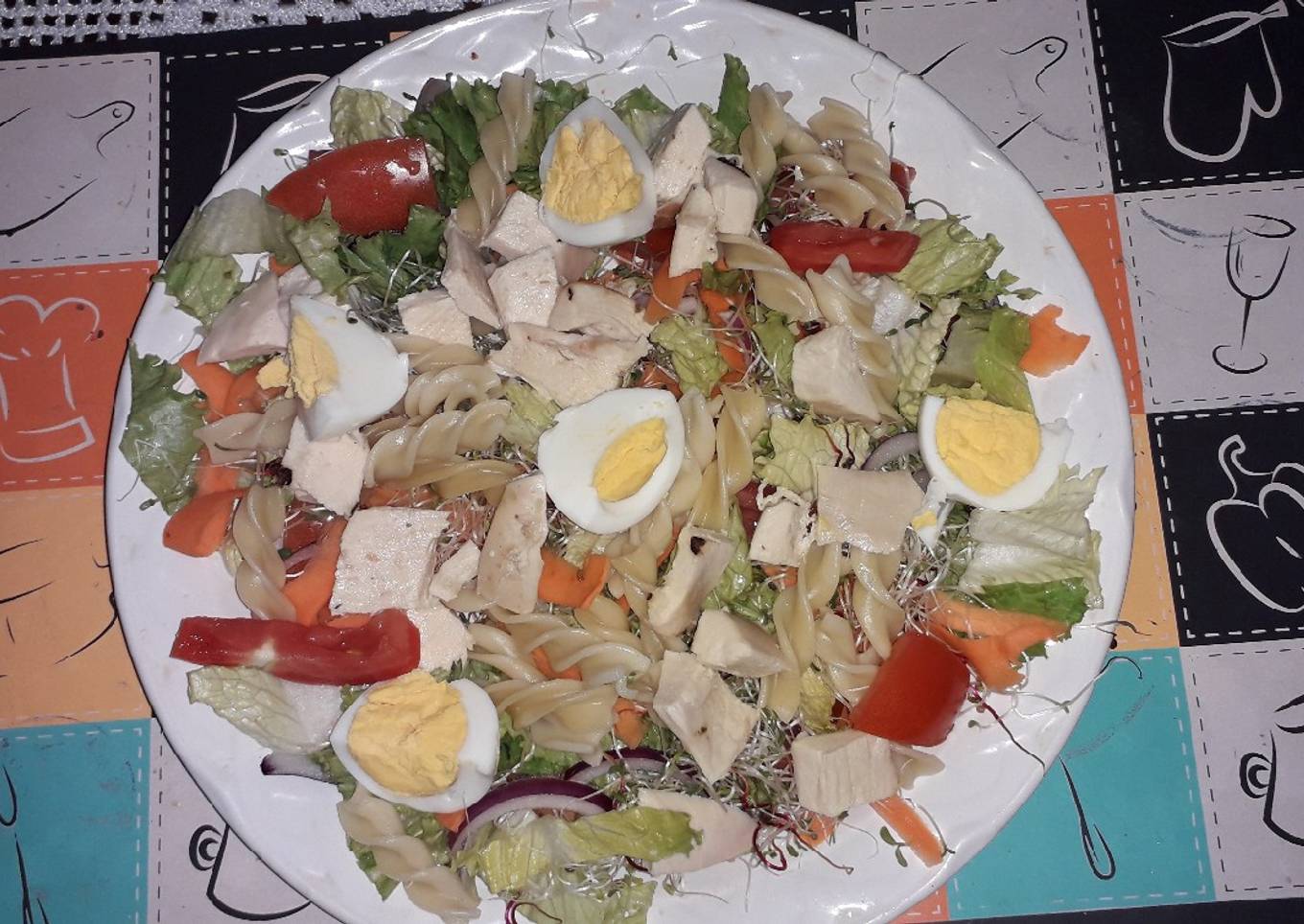 - Tenemos la verdura, bien desinfectada, rebano cebolla, pico tomate, rallo zanahoria, pasta ya cocida, huevo cocido, y pollo, tenía pechuga cocida que corte en cuadros. No soy fan de la carne así se le puse muy poca carne y más verdura, acomoda todos los ingredientes.