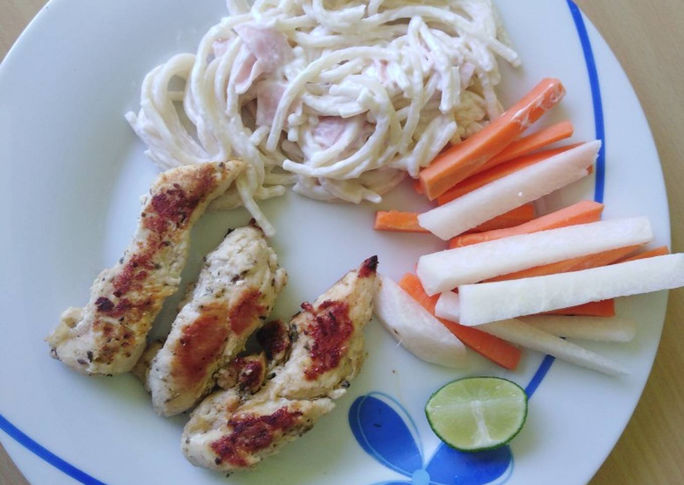 - Se arma el plato con fajitas, spaghetti y los palitos de jícama, zanahoria y una mitad de limón. Espero les guste.